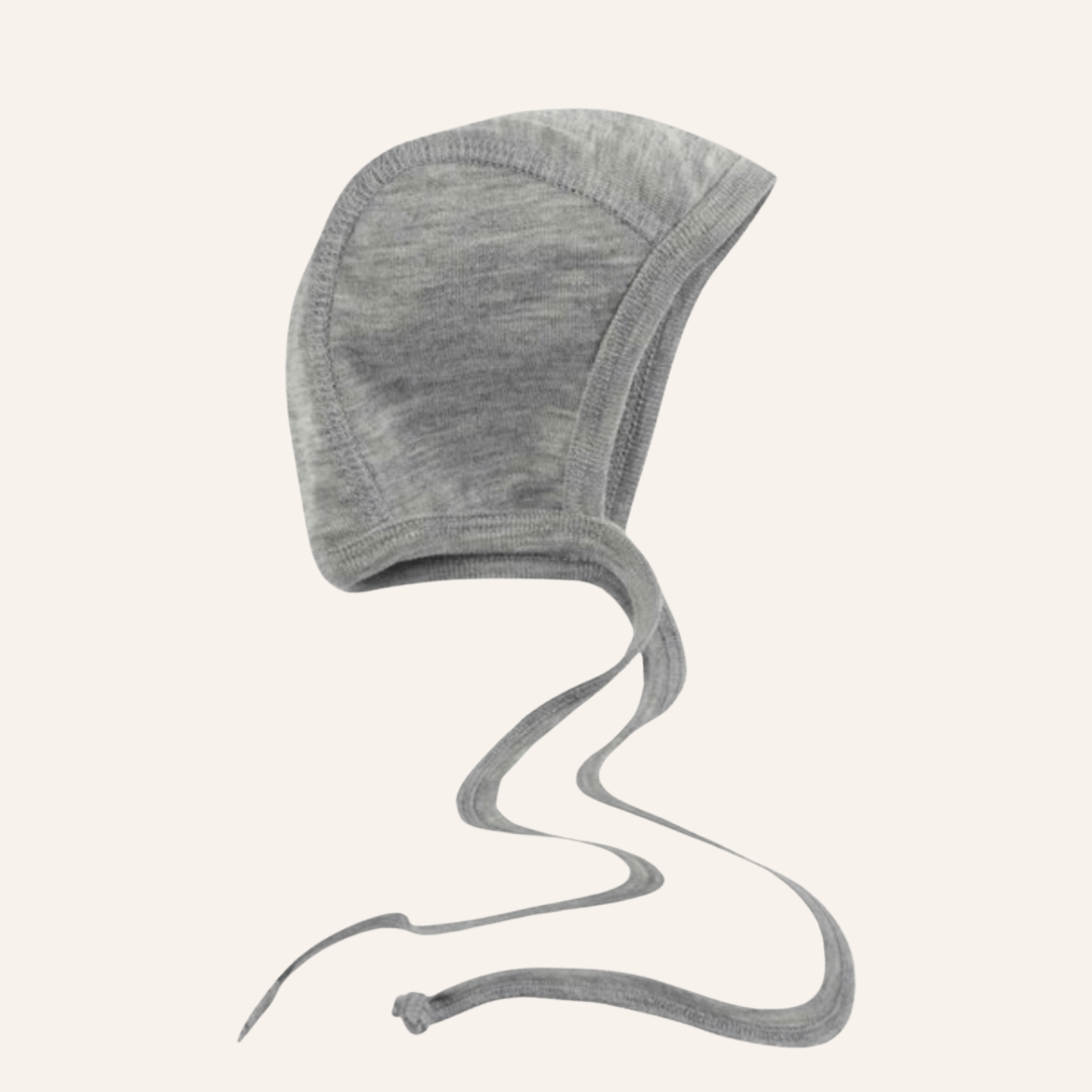 Heerlijk warm grijs strikmutsje van 100% biologische wolfleece. Dit mutsje van Engel nature is echt een baby musthave!