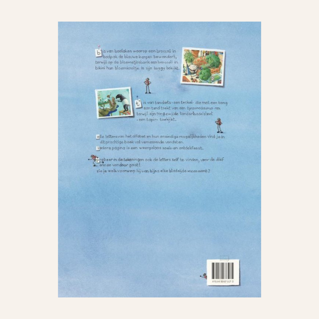 B is van badlaken waarop een broccoli in badpak de blauwe bergen bewondert, terwijl op de bloemetjesbank een broccoli in bikini hun bloemkooltje in zijn buggy bekijkt. L is van luipaard in legging en lakschoenen, die lekker ligt te luieren voor zijn laptop. T is van tandarts - een teckel - die met een tang een tand trekt van een tyrannosaurus rex terwijl zijn toegewijde tandartsassistent - een tapir - toekijkt. Alle letters van het alfabet en hun oneindige mogelijkheden vind je in dit prachtige boek vol verrassende vondsten. Iedere pagina is een weergaloos zoek- en ontdekfeest. Probeer in de tekeningen ook de letters zelf te vinden, voor de dief ermee vandoor gaat! Zie je welk voorwerp hij van bijna elke bladzijde meeneemt?