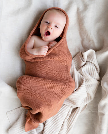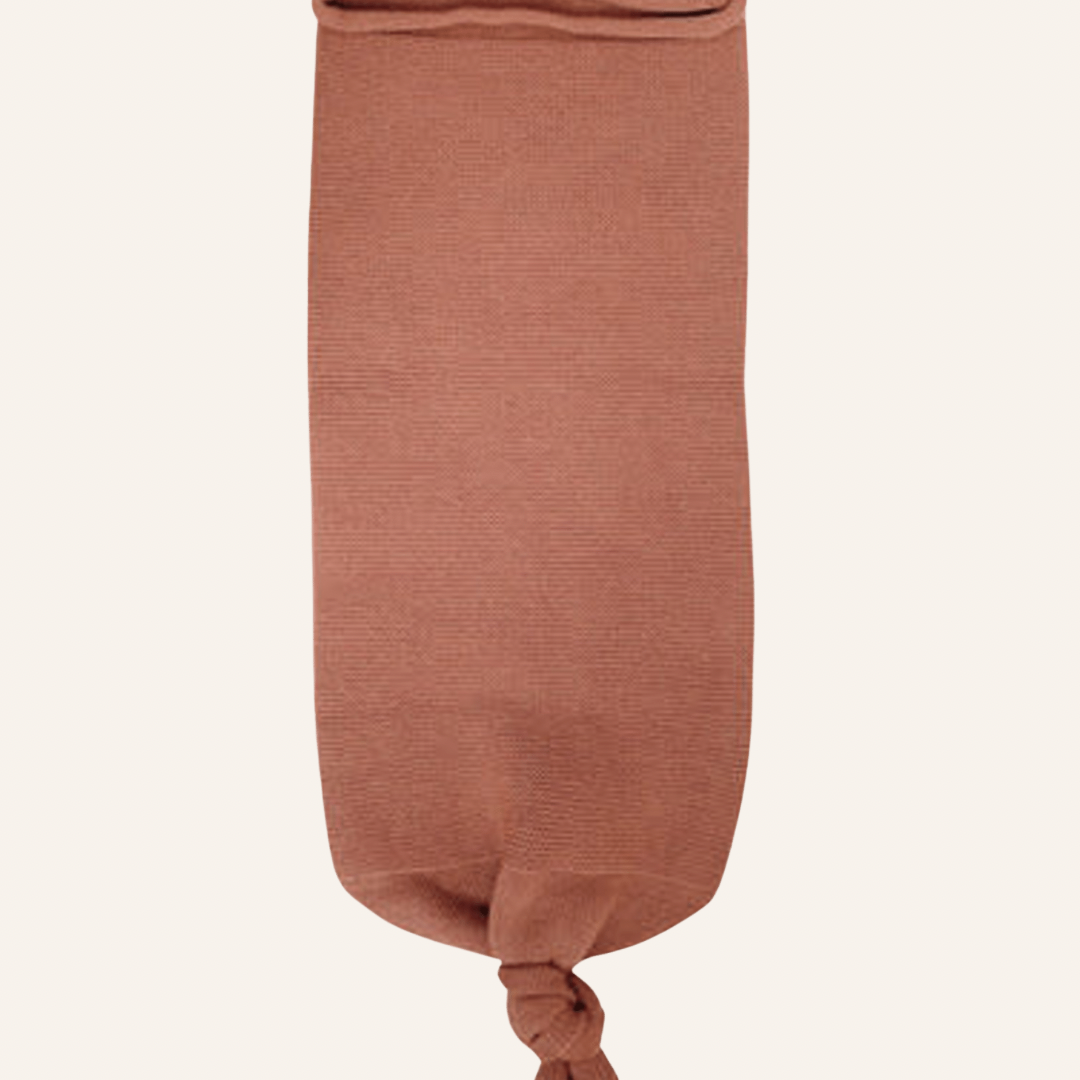 Hvid cocoon in de kleur Brick. Een zacht gebreide wollen cocoon van Hvid. De rond gebreide cocoon is gemaakt van merinowol en houdt je baby op de juiste tempratuur. De cocoon omhult je kleintje en geeft een veilig en geborgen gevoel, net als in de baarmoeder.