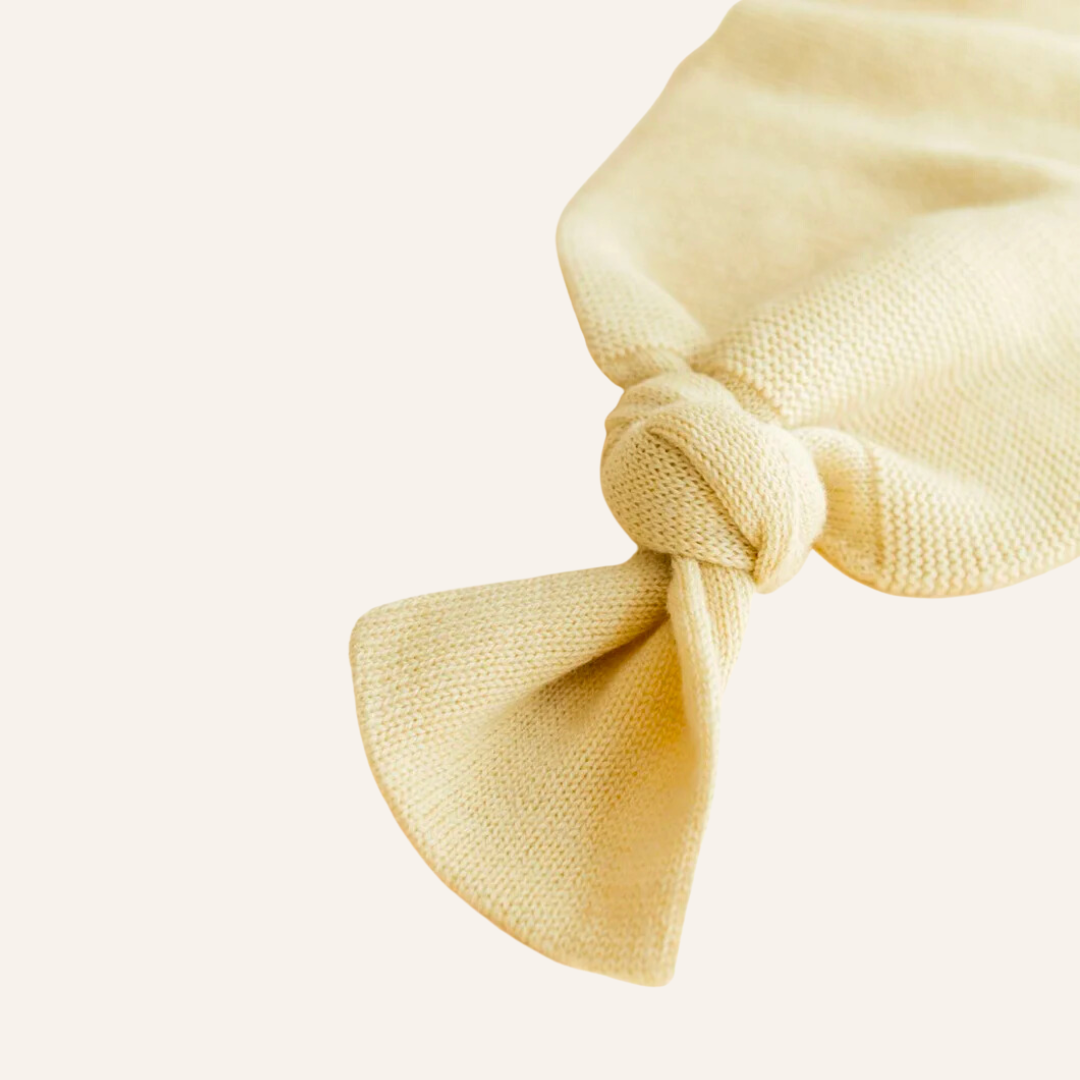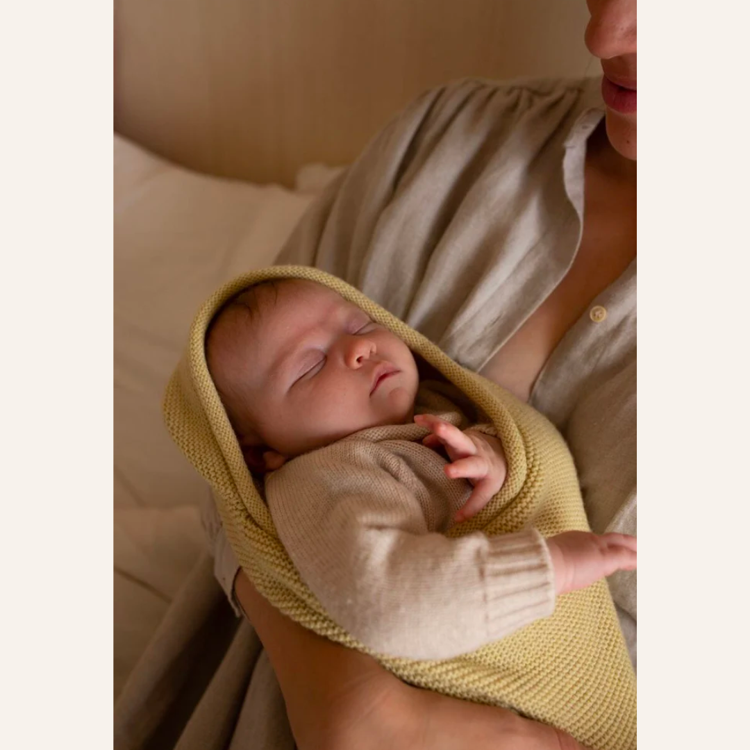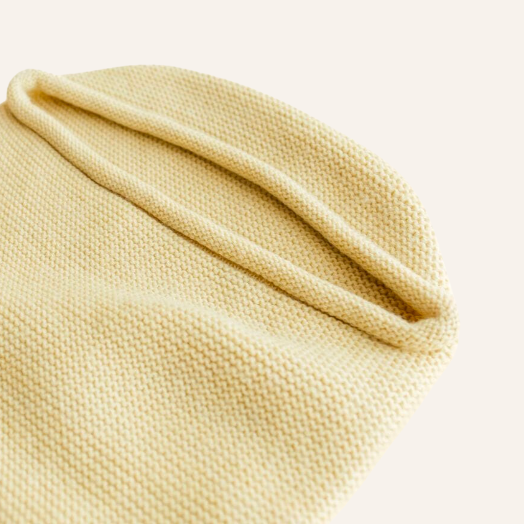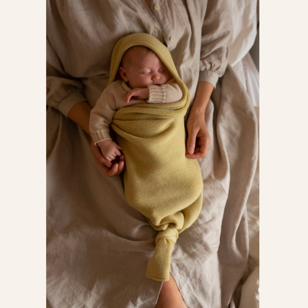 Hvid cocoon in de kleur Light Yellow. Een zacht gebreide wollen cocoon van Hvid. De rond gebreide cocoon is gemaakt van merinowol en houdt je baby op de juiste temperatuur. De cocoon omhult je kleintje en geeft een veilig en geborgen gevoel, net als in de baarmoeder.