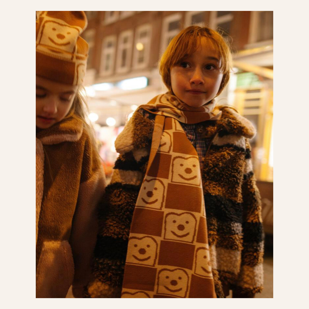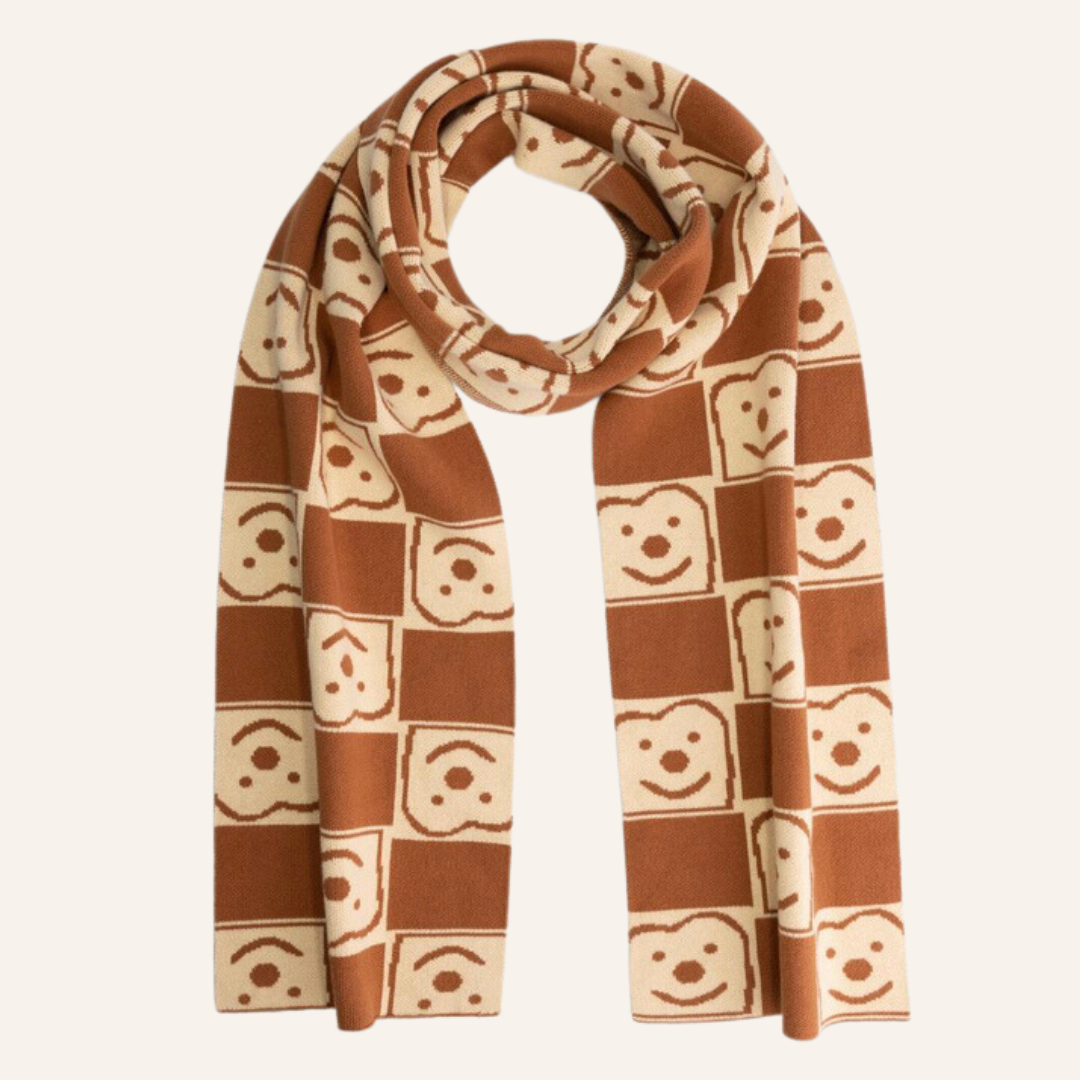 Mooie warme sjaal van Daily Brat met allemaal grappige broodjes.