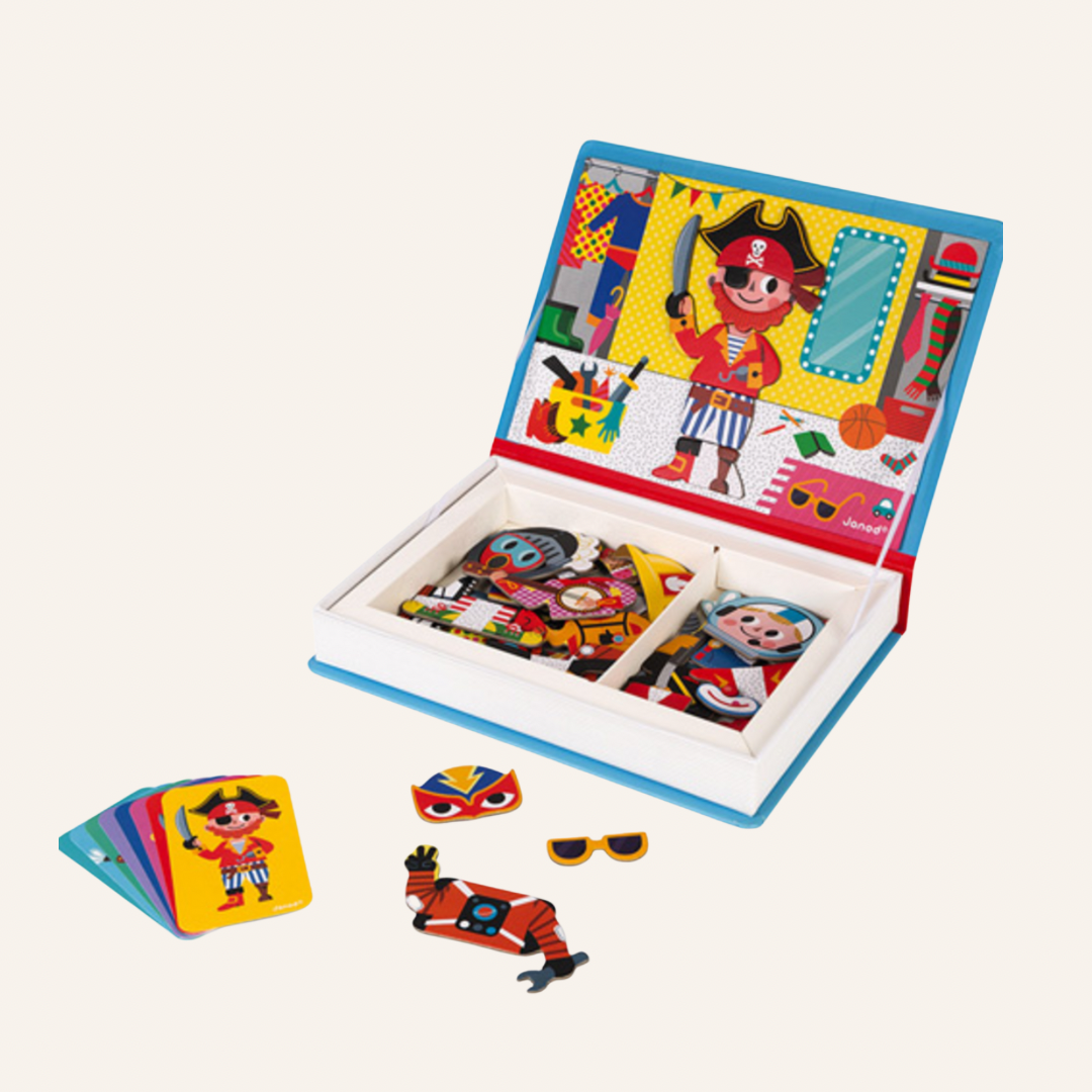 Educatief magneetspel van karton met als thema: verkleedfeest jongens. Als je het "boek" opent is het een soort koffertje.