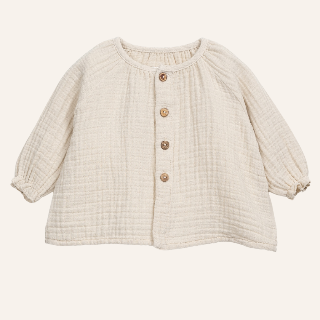 Account aanmakenAan de voorzijde sluit deze top met kokosnootknoopjes. Er zit elastiek in de boordjes zodat de blouse mooi aansluit rondom de polsjes. We hebben er ook een bijpassend broekje in wafelstof bij als je een mooie set wil samenstellen.