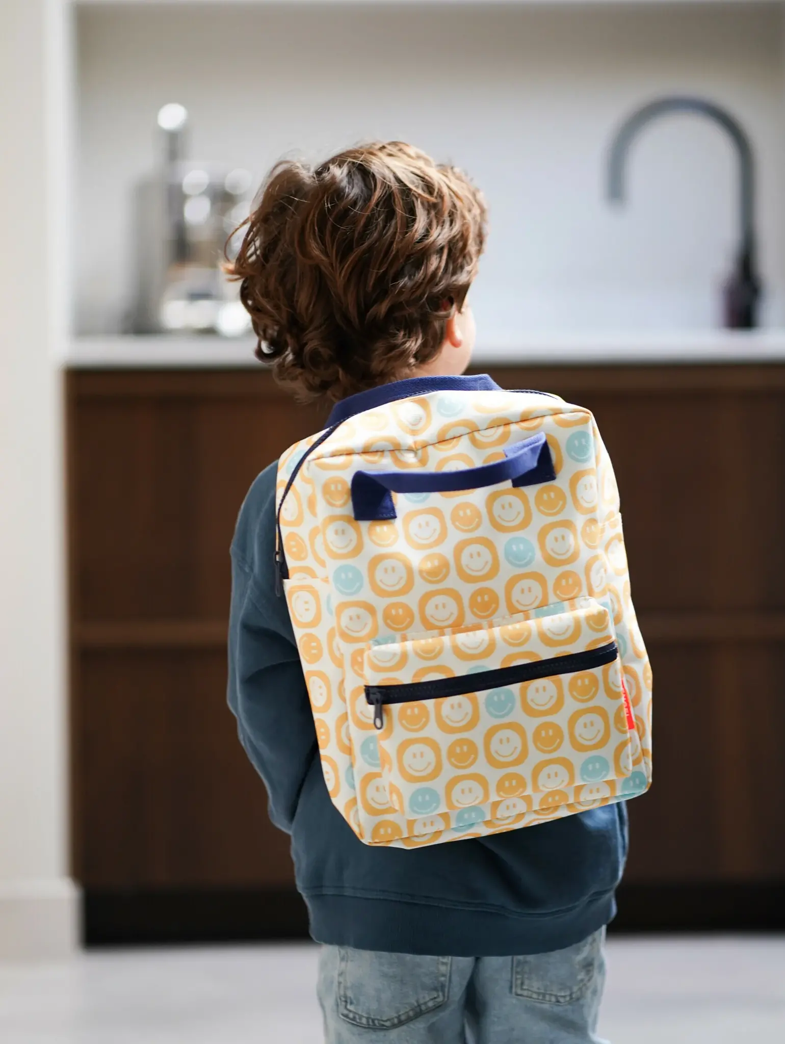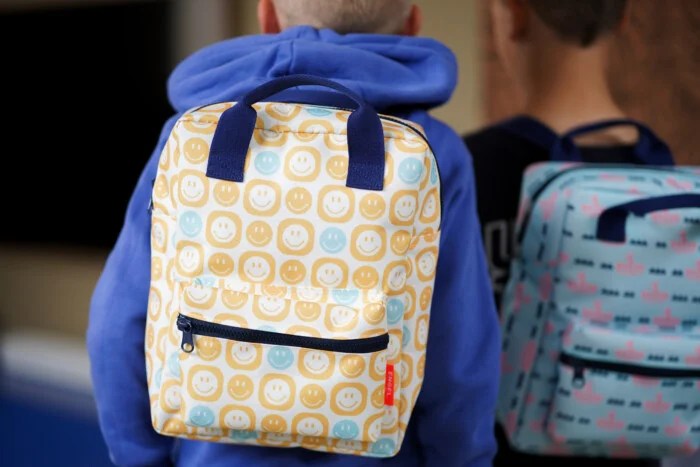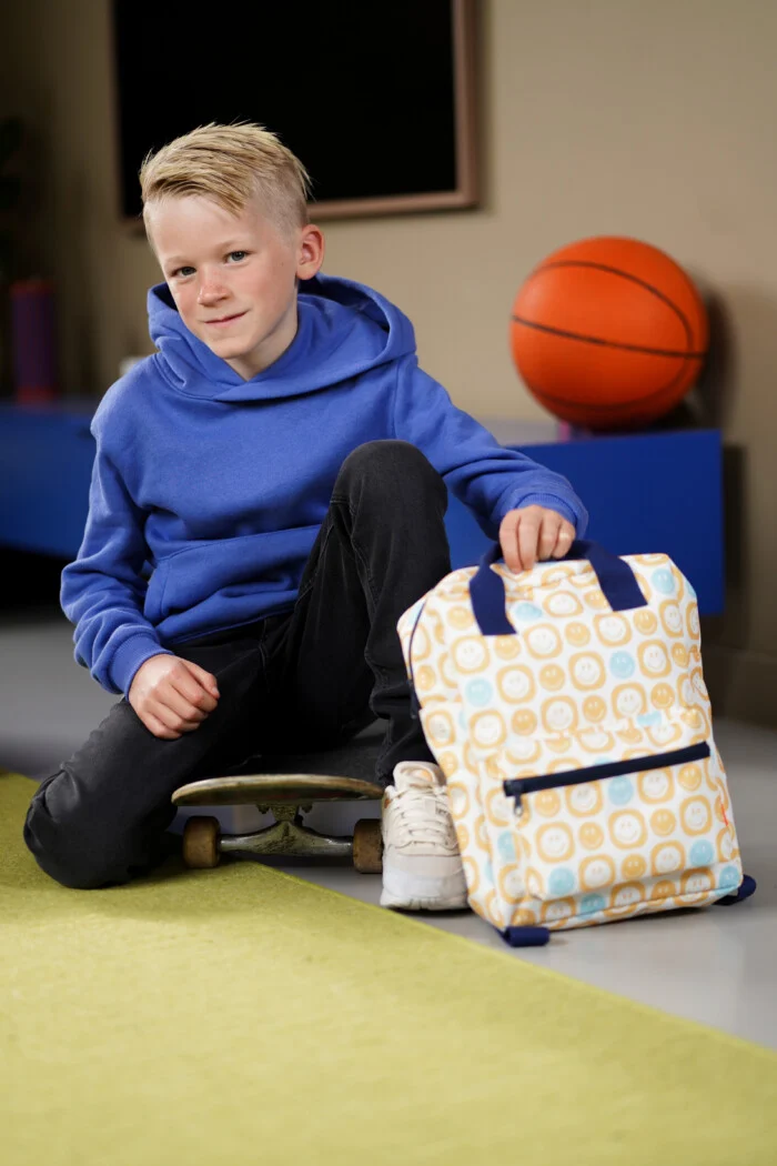 De Smiley rugzak medium is milieuvriendelijk en is gemaakt van gerecyclede PET flessen. De waterafstotende voering in combinatie met het stevige en ruime ontwerp maakt de rugzak heel geschikt om iedere dag mee naar school te nemen. De rugzak heeft een afmeting van 31 x 23 x 10 cm en is ruim genoeg voor een broodtrommel en twee drinkbekers. Het elastiek aan de binnenzijde houdt de beker goed op zijn plek en de broodtrommel kan netjes in een afsluitbaar vak met klittenband geplaatst worden.