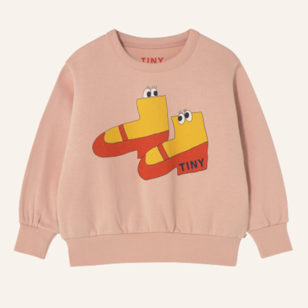 Lichtroze trui met grappige schoenen er op.